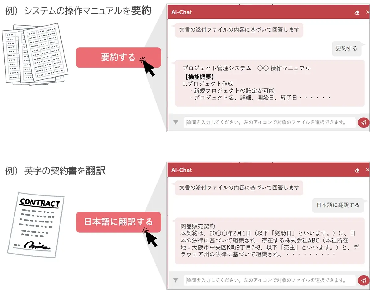 生成AIとの連携により、ユーザは1クリックで登録されたファイルの要約や日本語への翻訳が可能です。これにより、膨大な情報から要点を迅速に把握し、外国語の契約書などを瞬時に日本語に翻訳できるため、他の翻訳ツールを使用する必要がなくなります。また追加指示が可能なため、日本語へ翻訳した内容をさらに要約するといった使い方もでき、素早く概要だけを把握したい時に役立ちます。迅速かつ的確な意思決定をサポートし、業務のスピードアップを実現します。