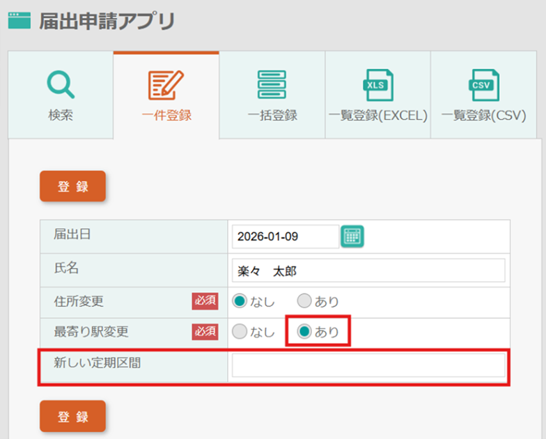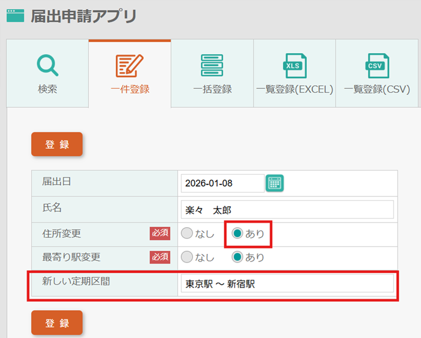 「住所変更あり」または「最寄り駅変更あり」を選択すると、新しい定期区間の入力項目が表示されます。