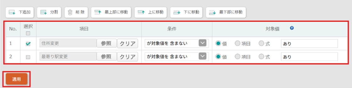 「住所変更なし」かつ「最寄り駅変更なし」の条件を設定します。