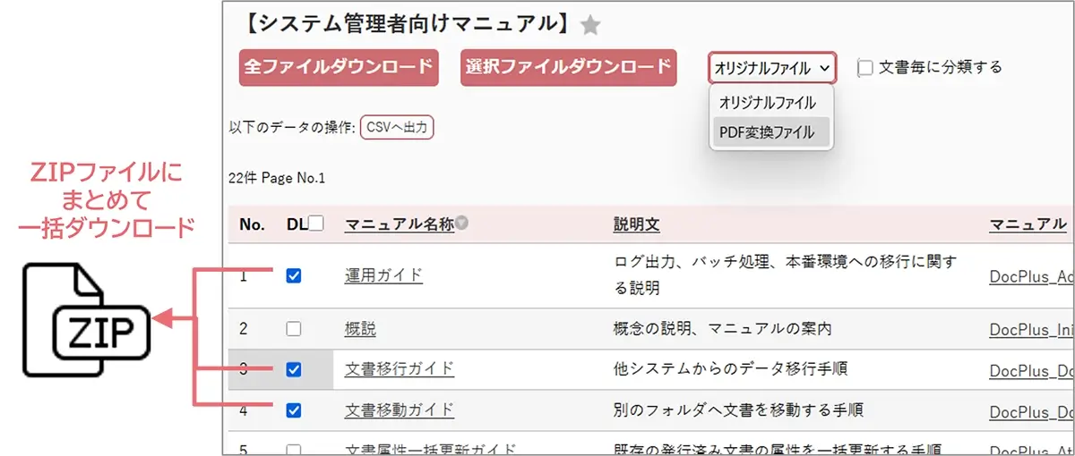 一括ダウンロードするファイルは、オリジナルファイルもしくはシステムで自動変換したPDFファイルから選択できます。