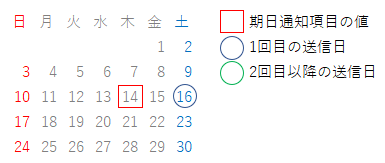 - 期日通知項目に入力した日付に期日通知開始日(日数)を足した日に送信します。