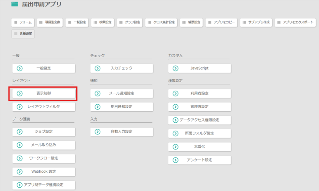 アプリ編集を開きます。 アプリ編集 > 各種設定:表示制御 をクリックします。