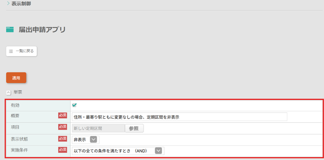 例では、届出申請アプリで「住所変更あり」または「最寄り駅変更あり」を選択した場合にのみ、新しい定期区間の入力項目を表示する方法を説明します。